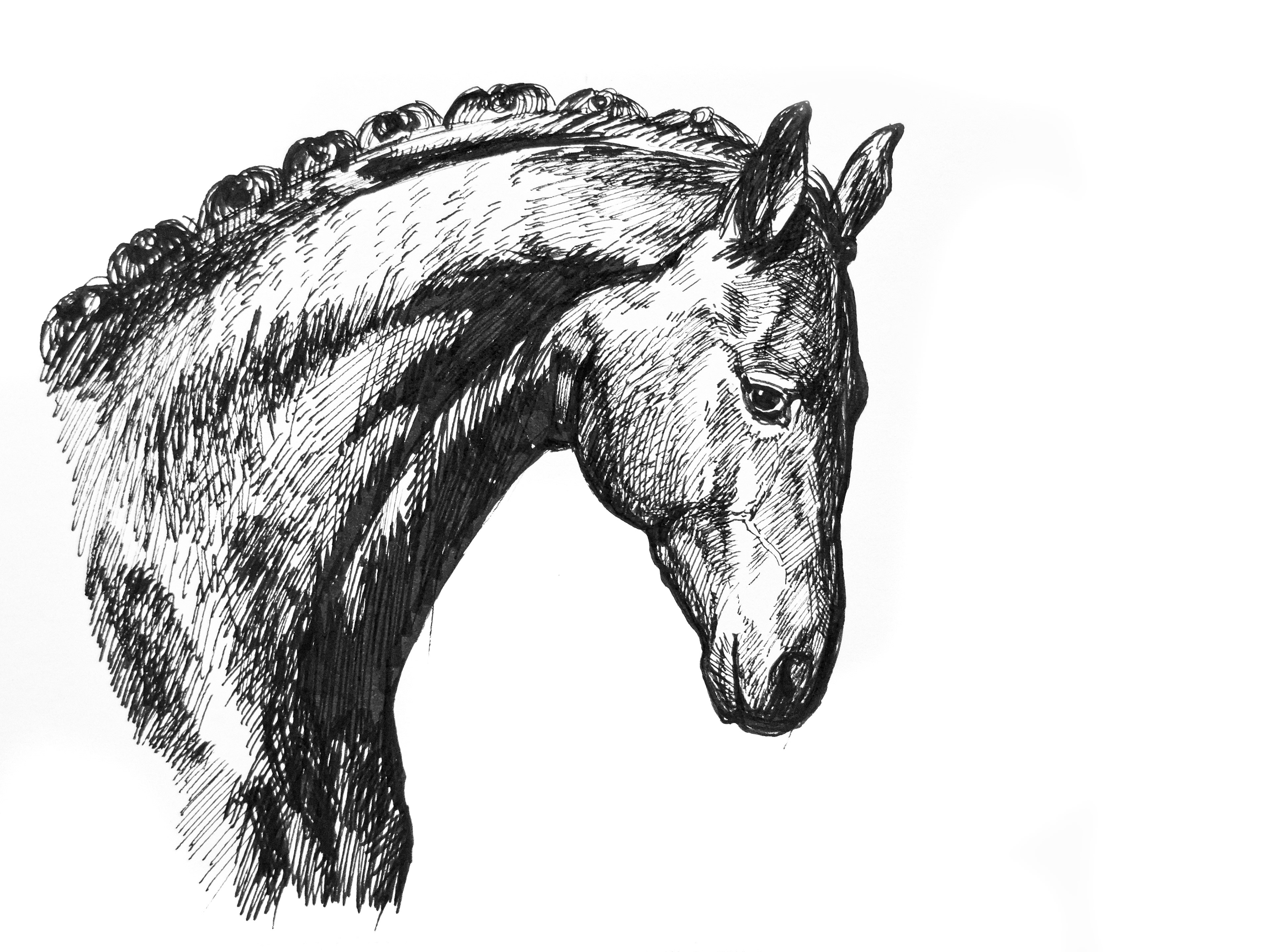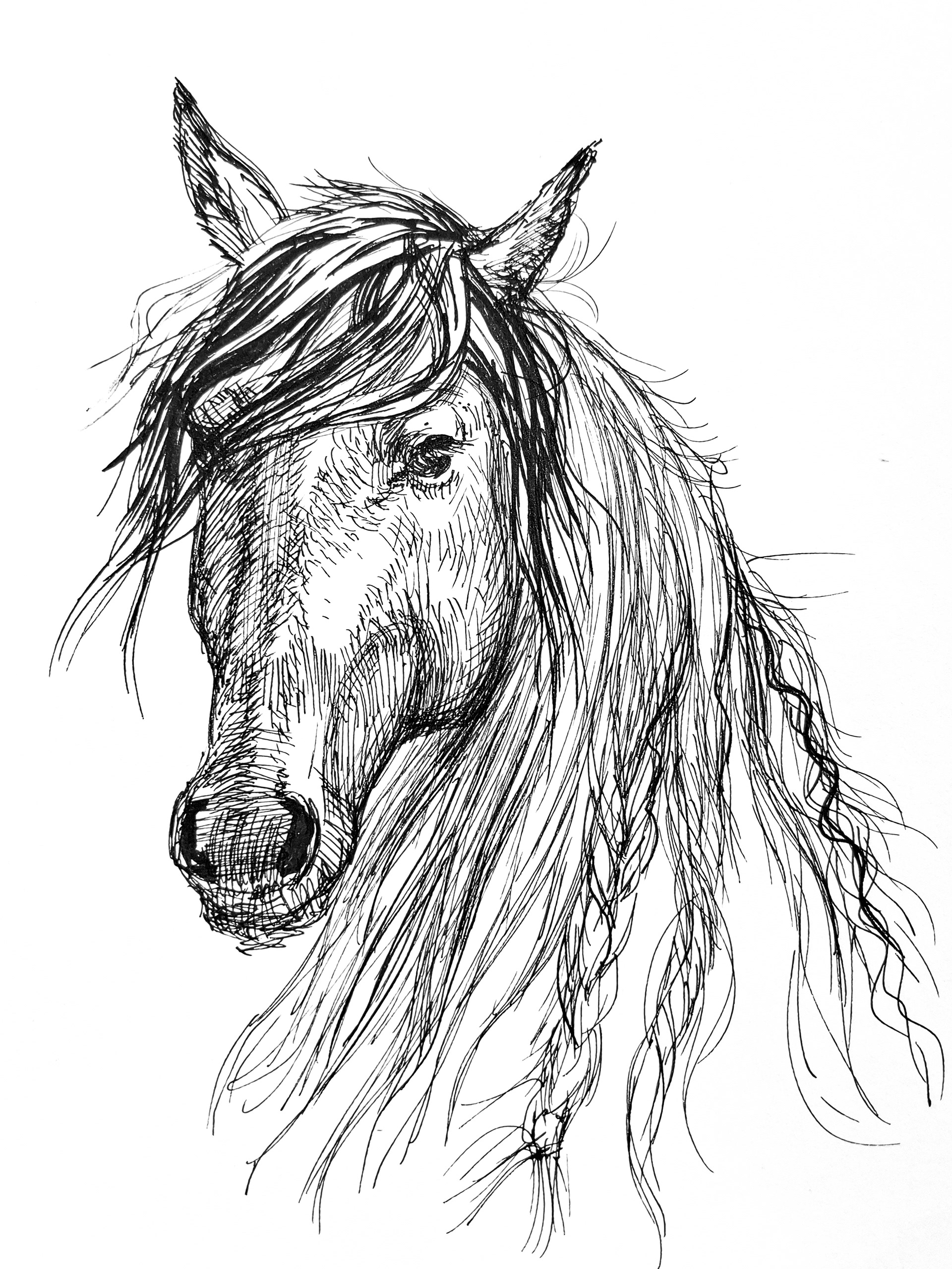 Detailed ink study emphasizing texture and movement through directional hatching. The mane and coat are rendered with rhythmic, gestural strokes, contrasting with more controlled lines in the facial structure. The result is a naturalistic yet expressive portrait that highlights character over idealization.