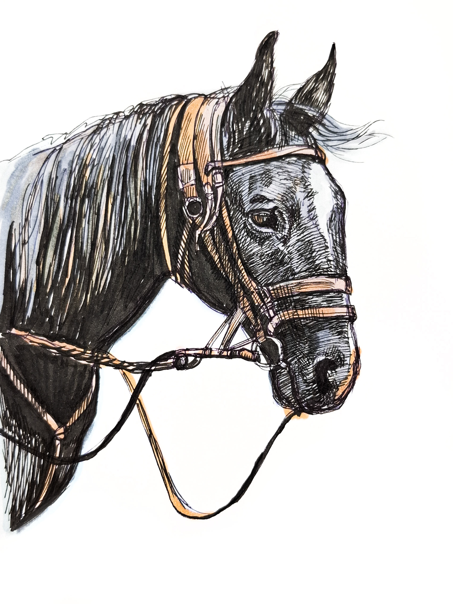 Pen and ink with selective watercolor wash. This piece focuses on the relationship between line and color, using transparent washes to accent the bridle and define planes of the face without overpowering the drawing. The layered lines create depth and texture, capturing both the physical presence and temperament of the horse.