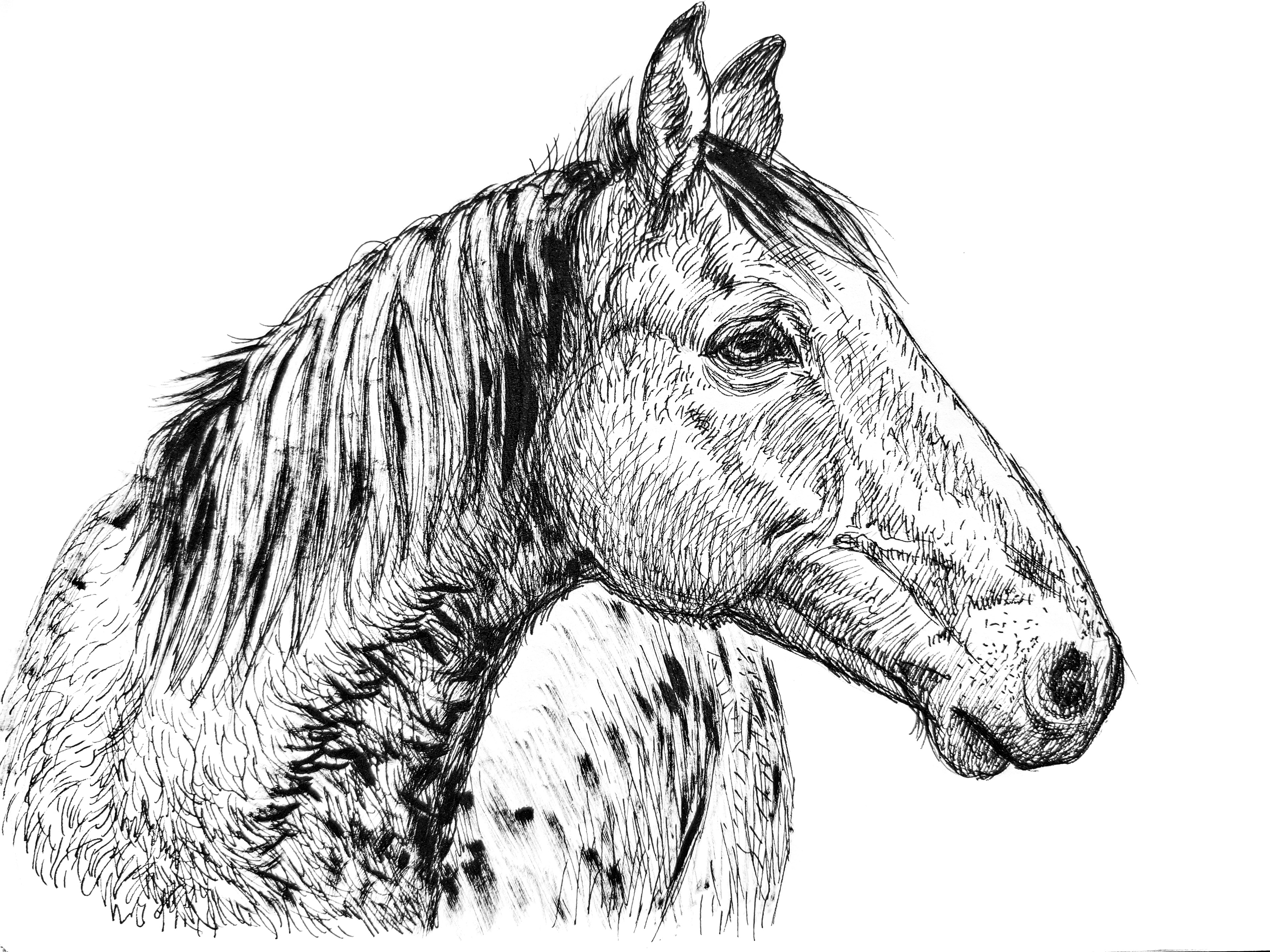 Detailed pen and ink line work serves the larger goal of capturing the horse’s presence. Careful attention to anatomy, texture, and subtle expression is combined with controlled variation in line density, creating drawings that feel both studied and quietly expressive.