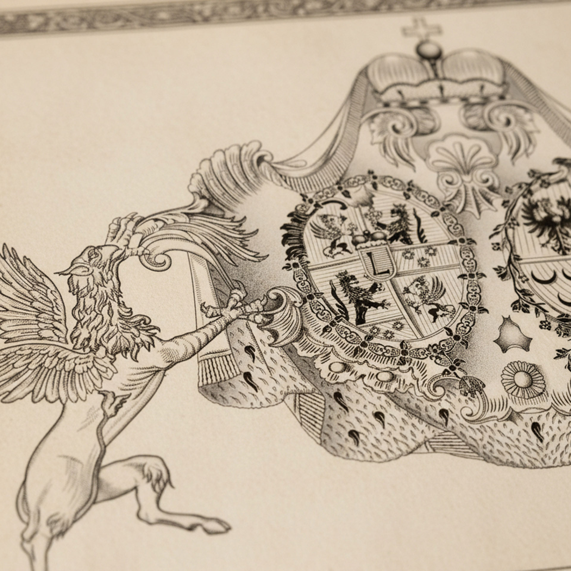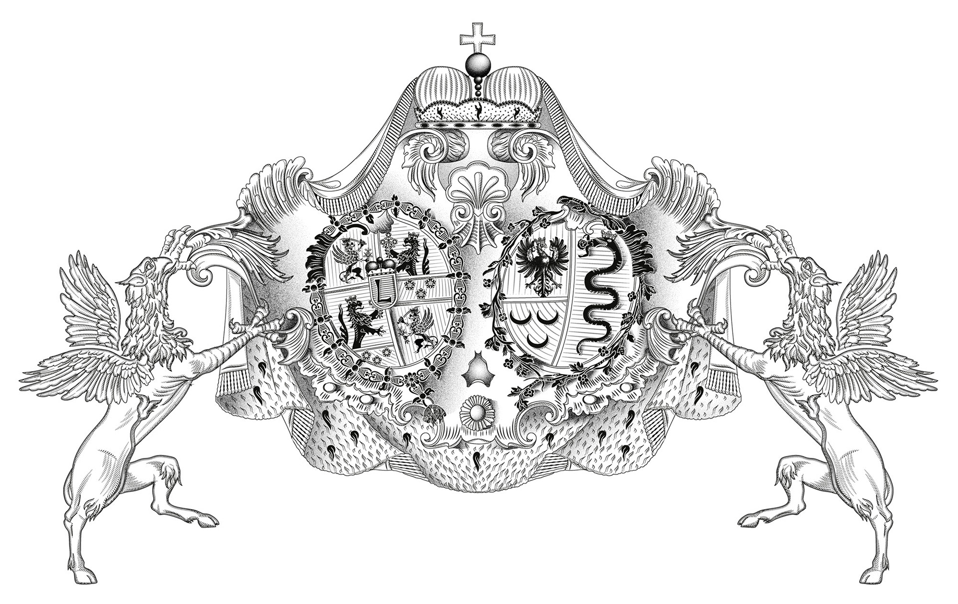 The illustration is executed in fine monochrome line work with stippling and engraving-style shading, giving the piece the appearance of a traditional copperplate engraving while remaining digitally produced. Particular attention was given to symmetry, ornamental scrollwork, textile folds, and heraldic detailing, ensuring both historical authenticity and visual elegance.