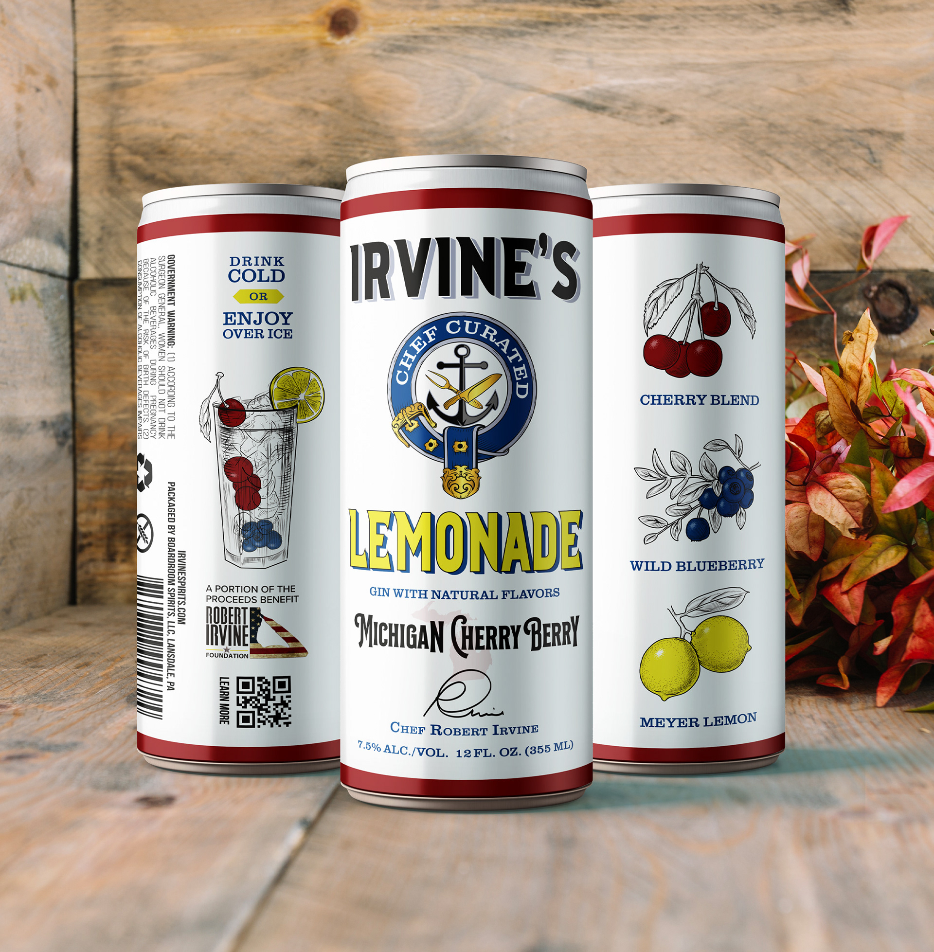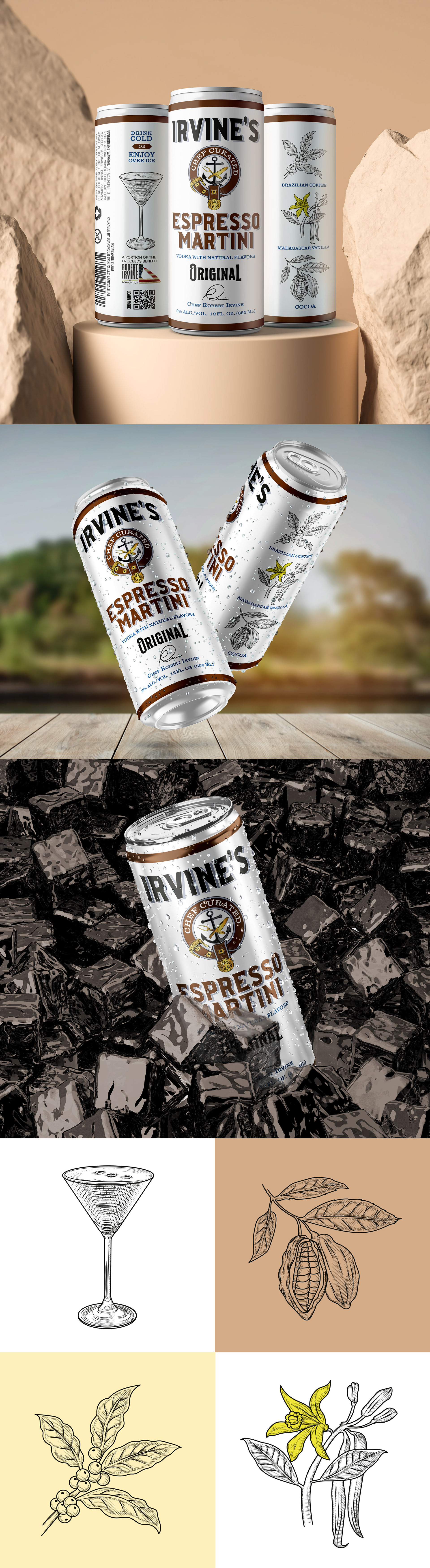 Unique hand-drawn artwork: cocktail image and ingredients on the sides. Overall clean, premium look with a touch of craftsmanship and vintage feel.