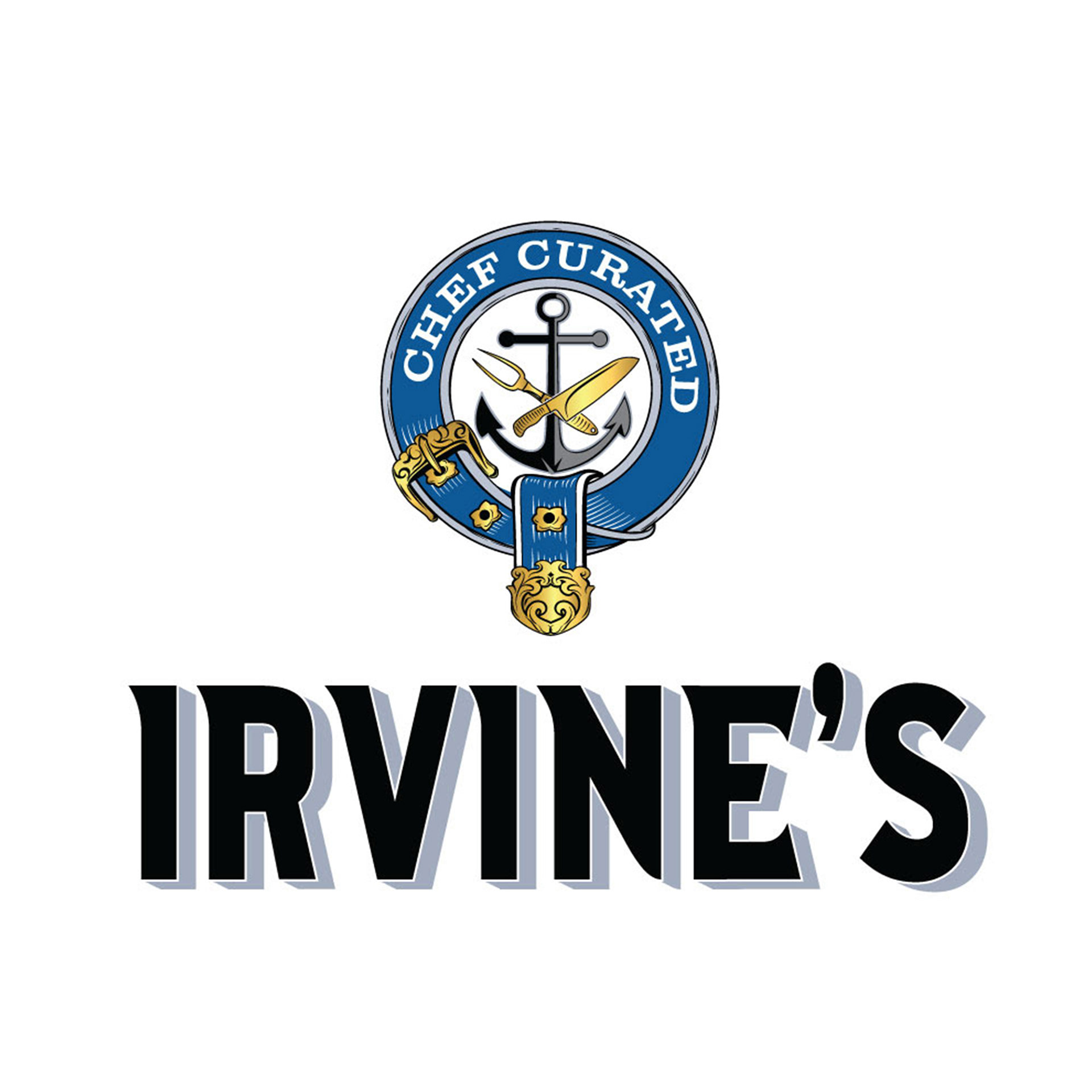 The logo references Chef Irvine’s Irish heritage through the belt motif, his military service, and his professional culinary career, represented by an anchor paired with crossed carving fork and chef’s knife.