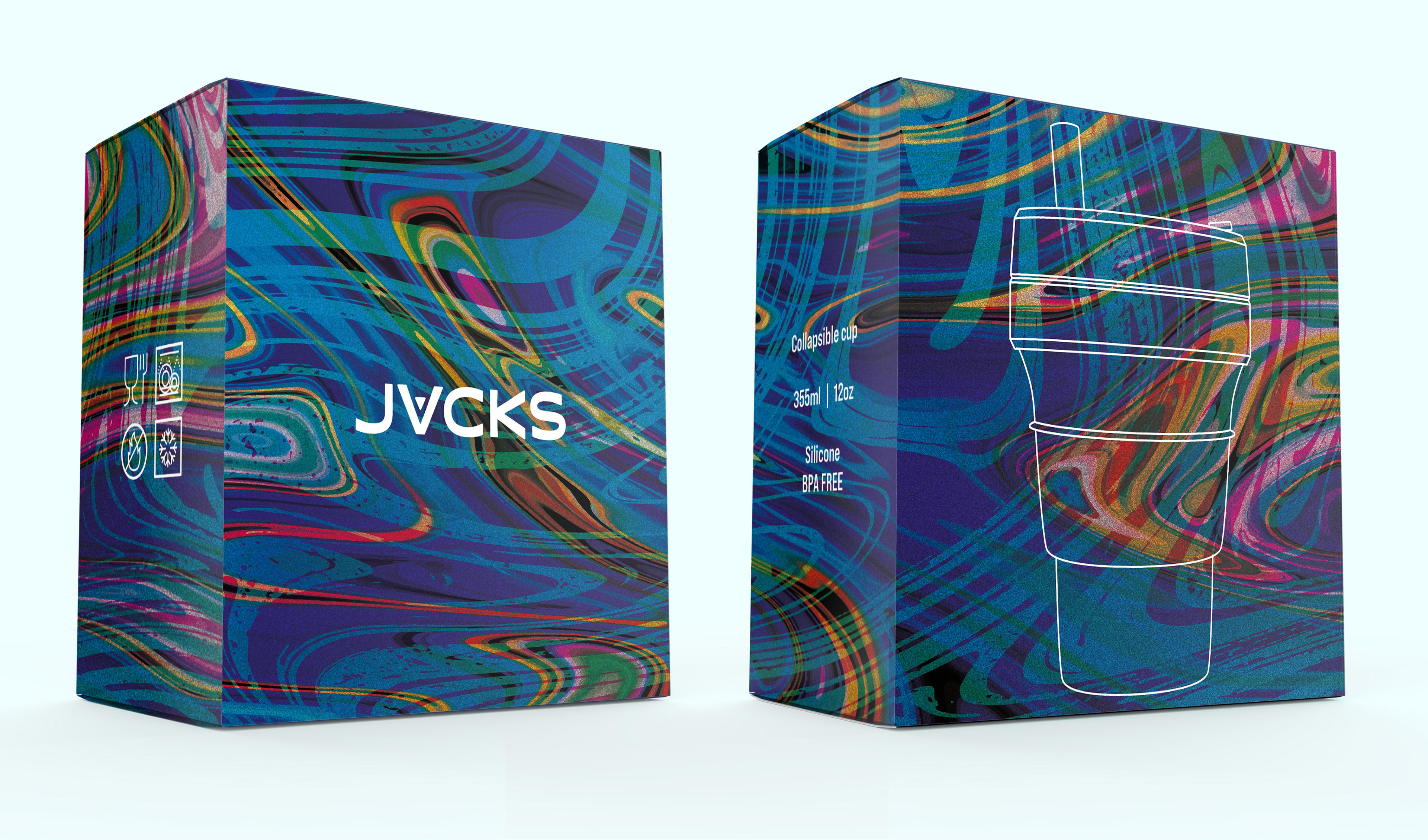Abstract design for collapsible cup box using bright, fresh, vivid and unusual color combinations and line-art.