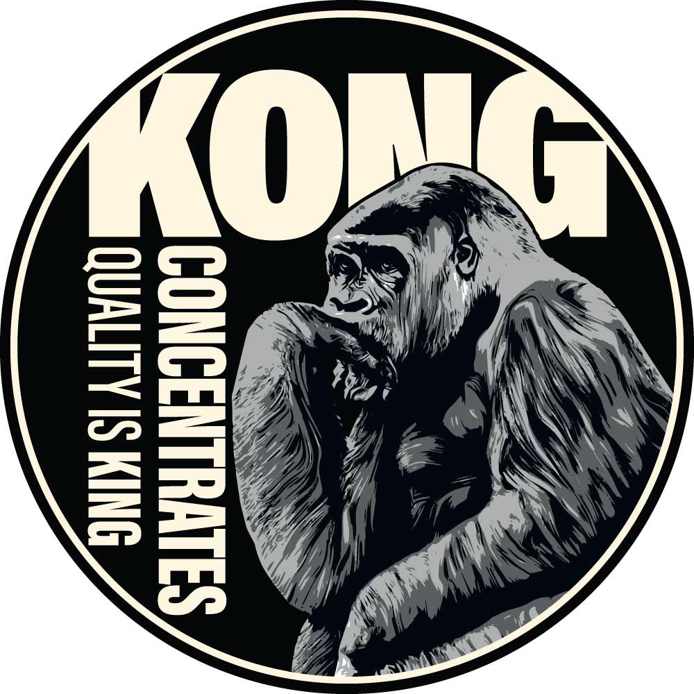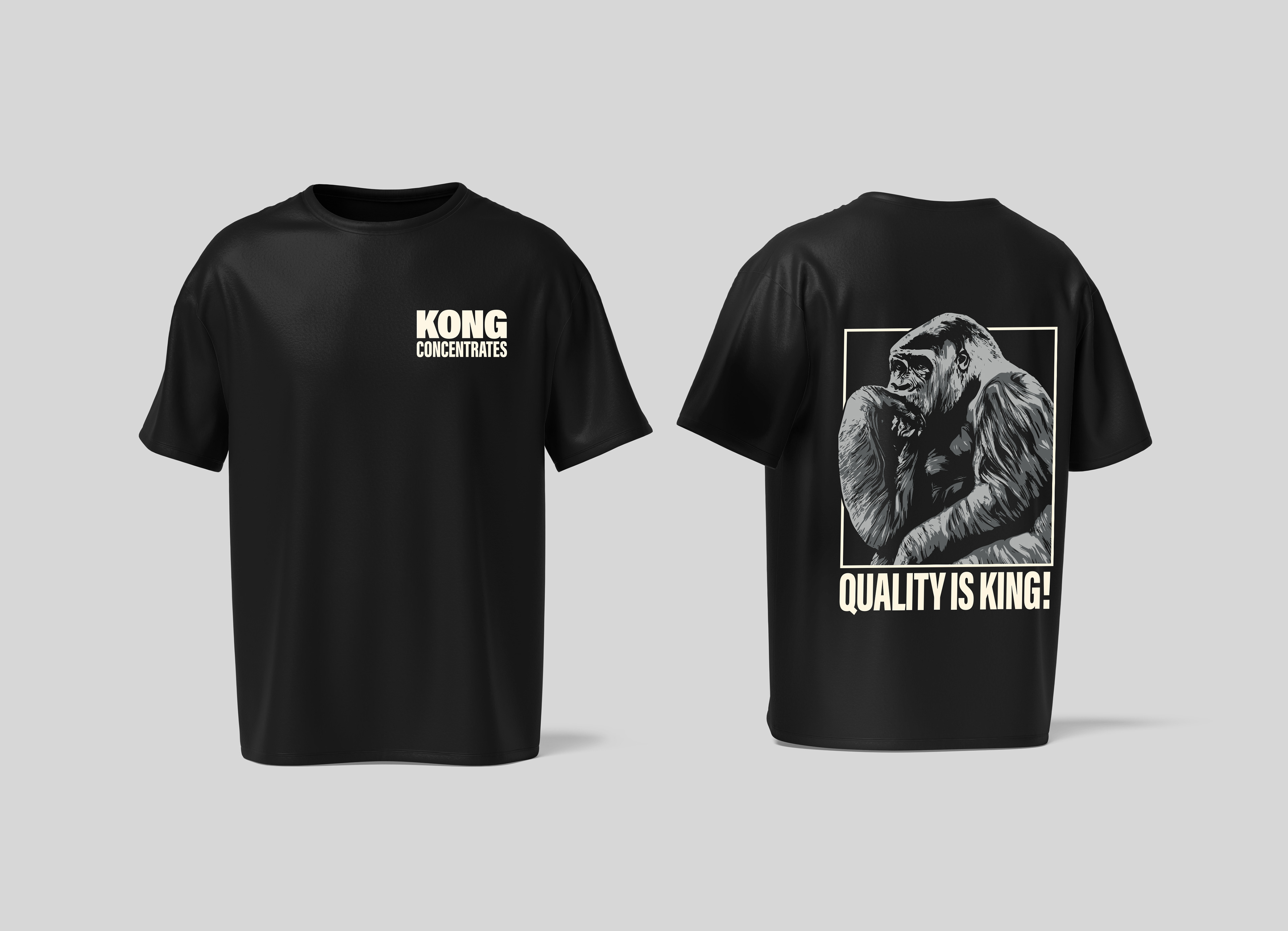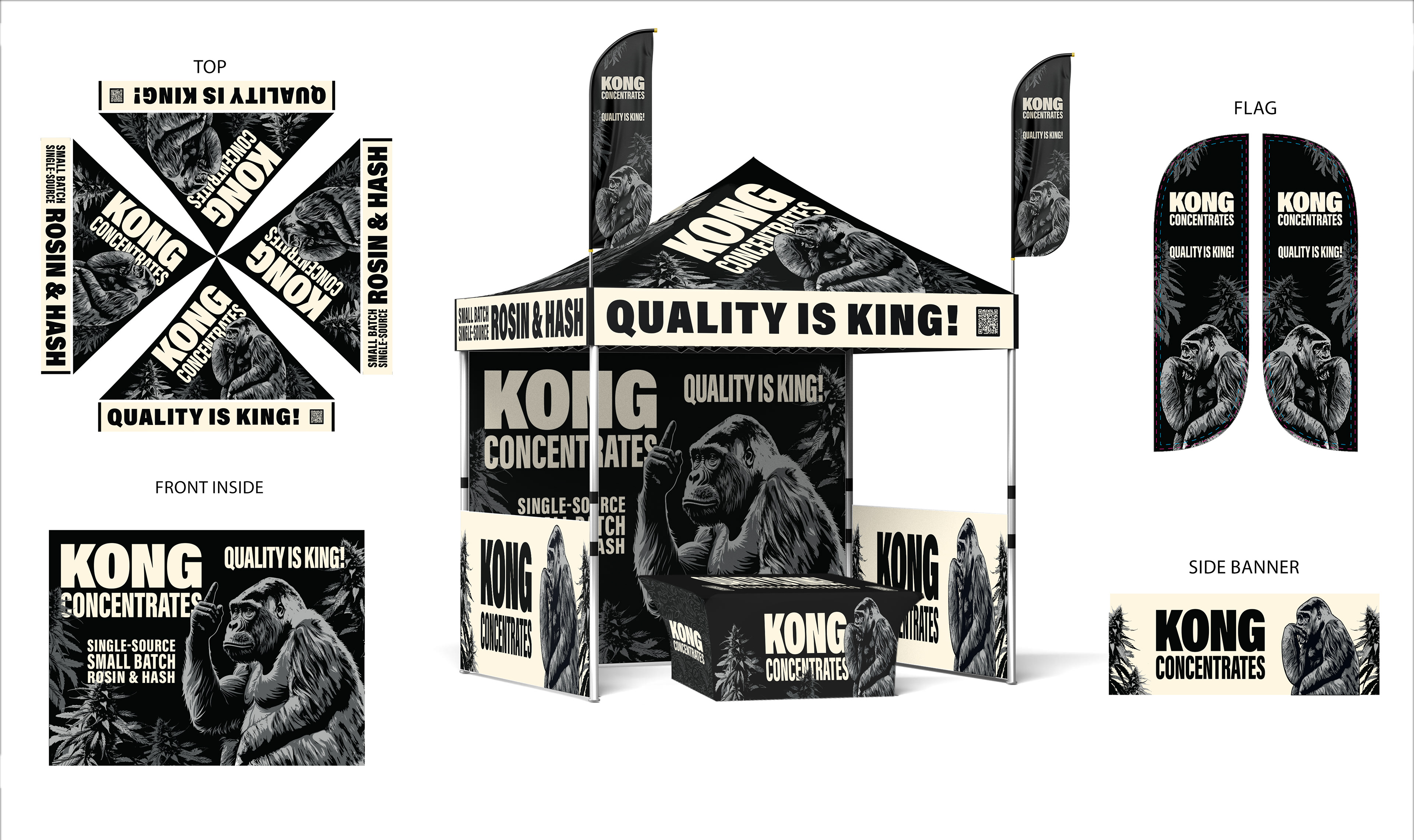 Complete event branding package for KONG CONCENTRATES including canopy, booth stand, banners, flags, and apparel design. The bold gorilla illustration, paired with oversized typography and the tagline “Quality is King!”, ensures strong visi bility and instant brand recognition. Consistent use of high-contrast black-and-ivory graphics creates a cohesive and powerful presence across all touchpoints, from display structures to merchandise.