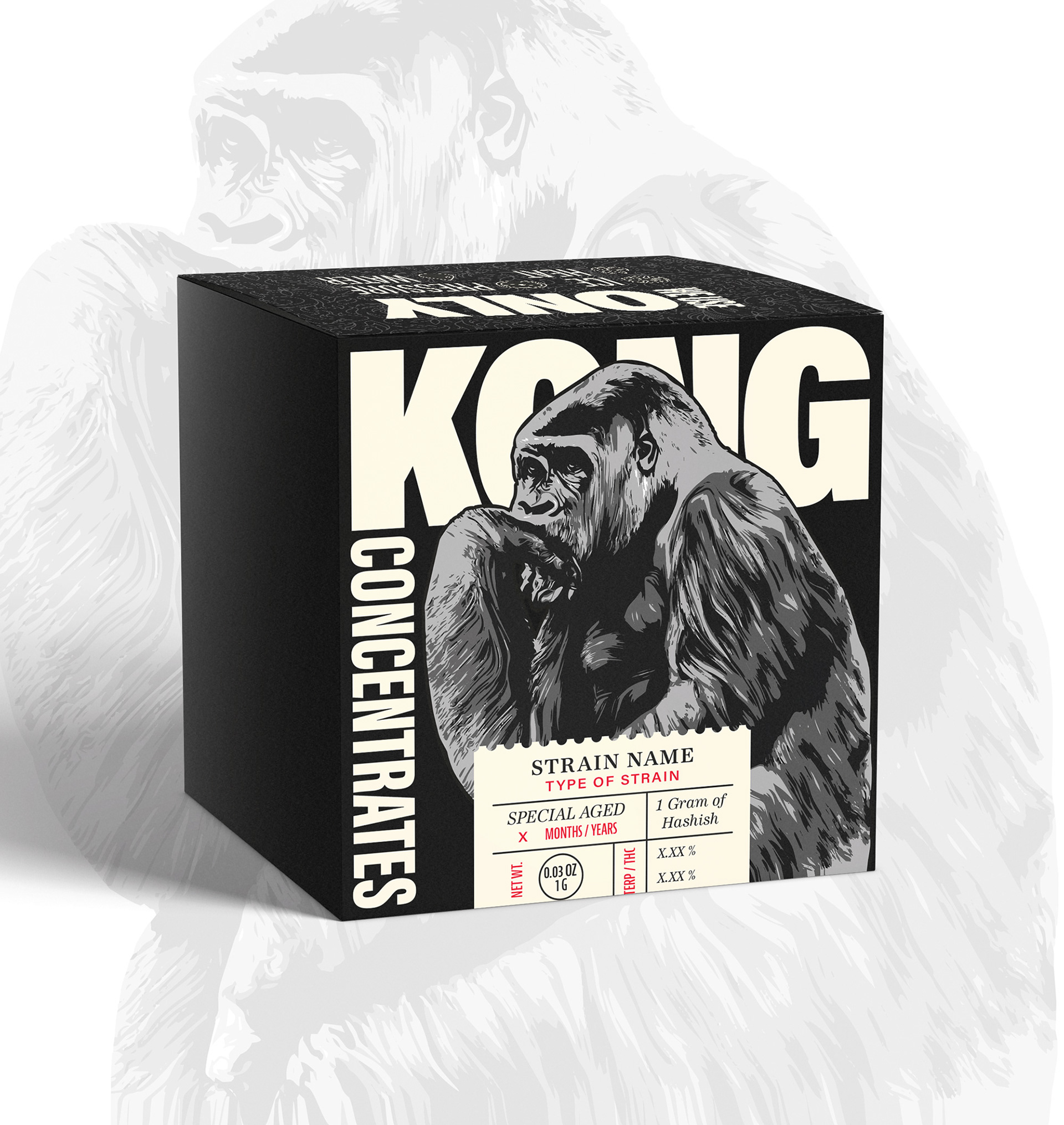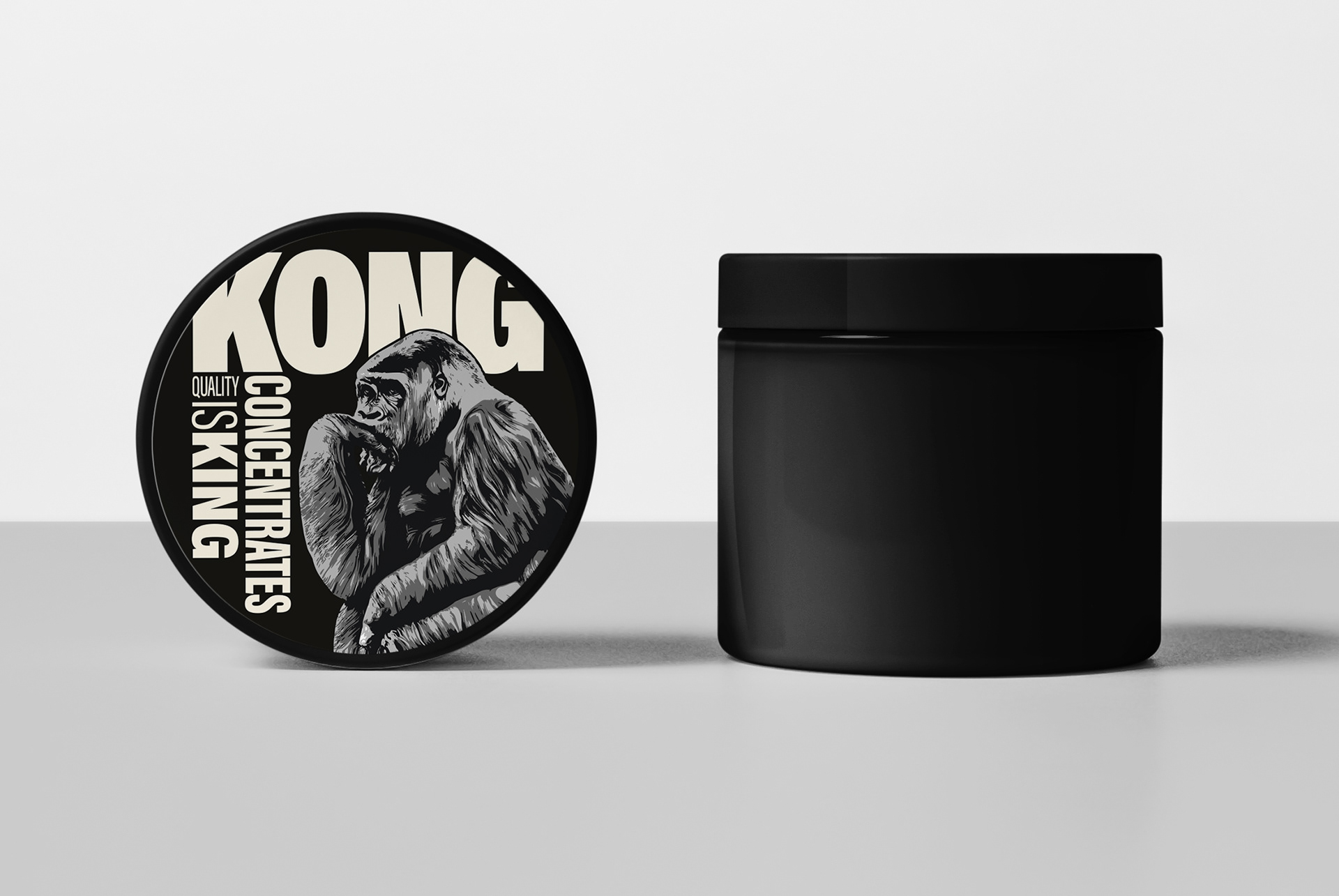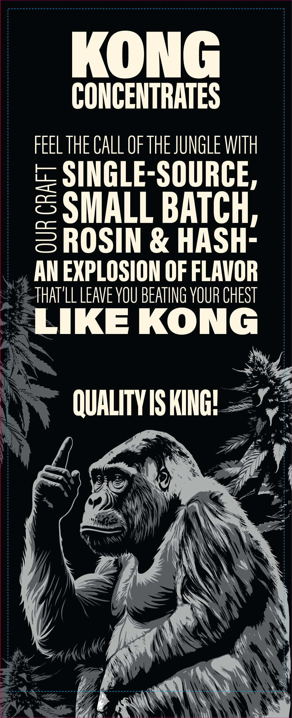 Complete event branding package for KONG CONCENTRATES including canopy, booth stand, banners, flags, and apparel design. The bold gorilla illustration, paired with oversized typography and the tagline “Quality is King!”, ensures strong visi bility and instant brand recognition. Consistent use of high-contrast black-and-ivory graphics creates a cohesive and powerful presence across all touchpoints, from display structures to merchandise.