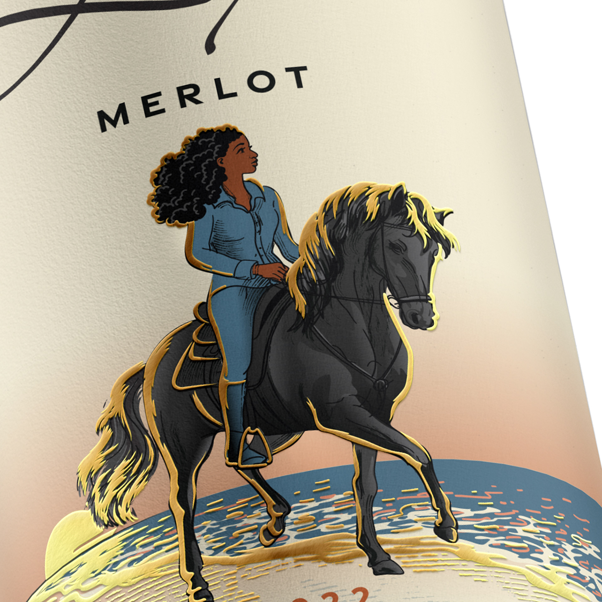 This label design blends elegance with storytelling, featuring a refined illustration of a young woman riding a horse at sunset. Gold foil accents mimic sunlit reflections on the sea, horse, and rider, adding depth and warmth. Blends tradition (script font, crest) with a modern, inclusive image. Designed to appeal to wine drinkers who appreciate a wine with both style and a narrative.