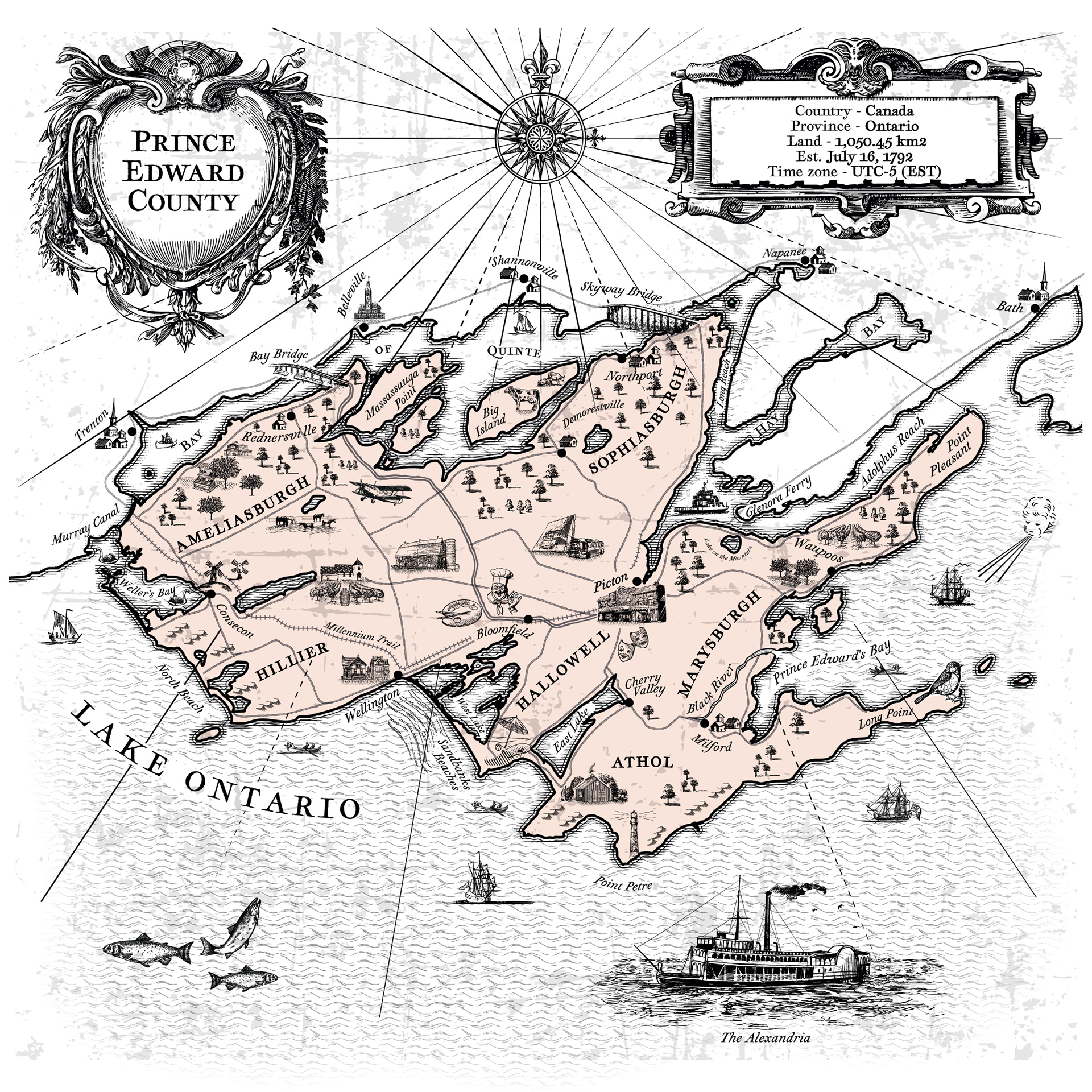 This map of Prince Edward County, Ontario, Canada, is a vintage-style illustrated map that blends cartographic accuracy with artistic embellishment. The entire map is rendered in a historical style reminiscent of 17th–18th century cartography. It's designed to evoke a sense of place, history, and heritage—ideal for tourism materials, heritage branding, or decorative use. The blend of practical cartography and romanticized illustration makes it visually engaging and richly atmospheric.