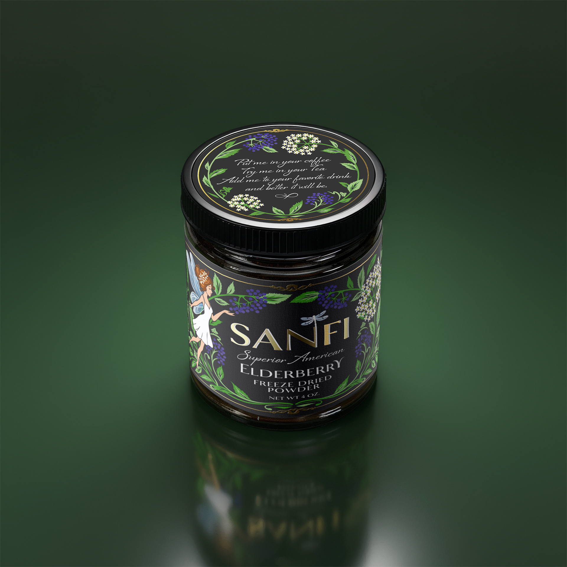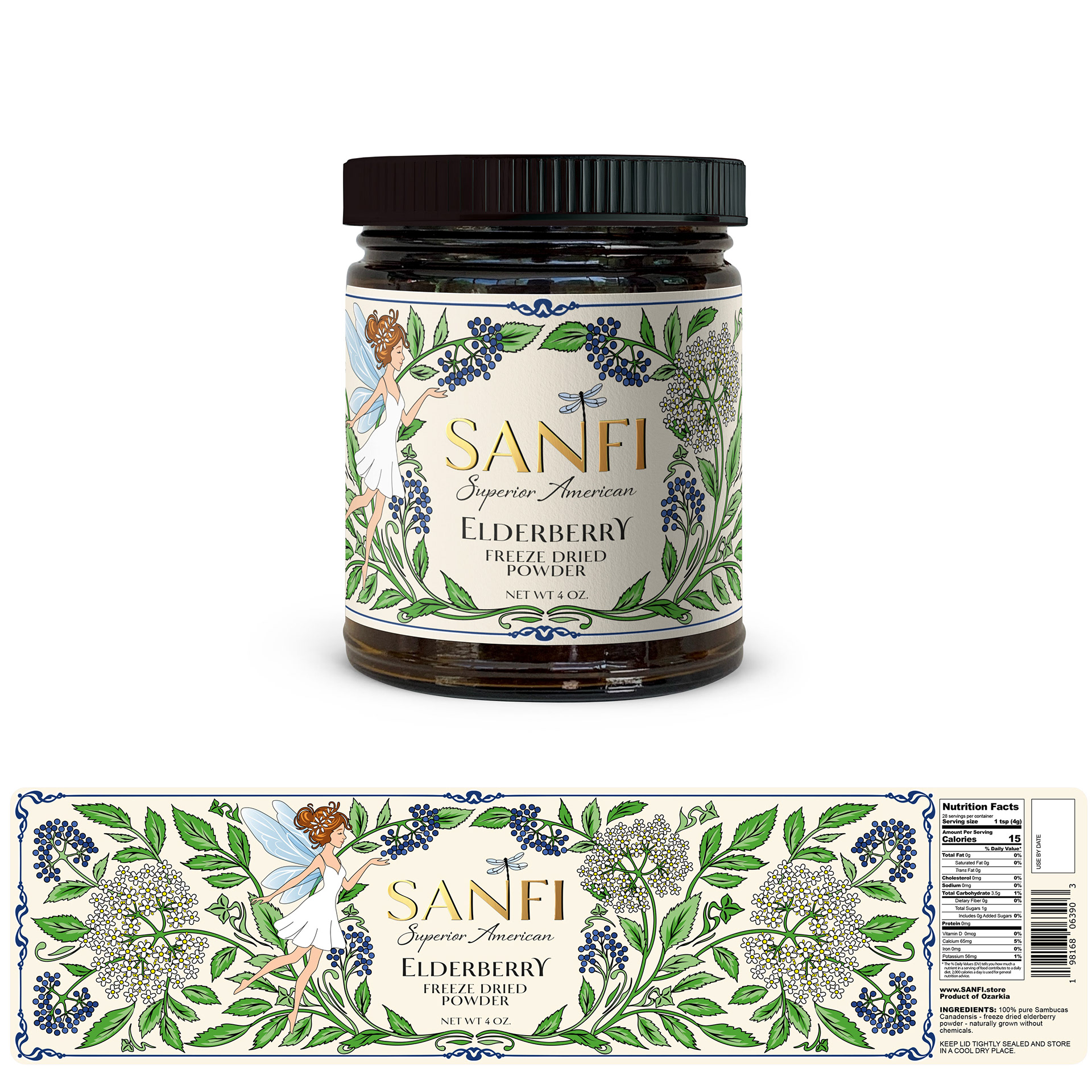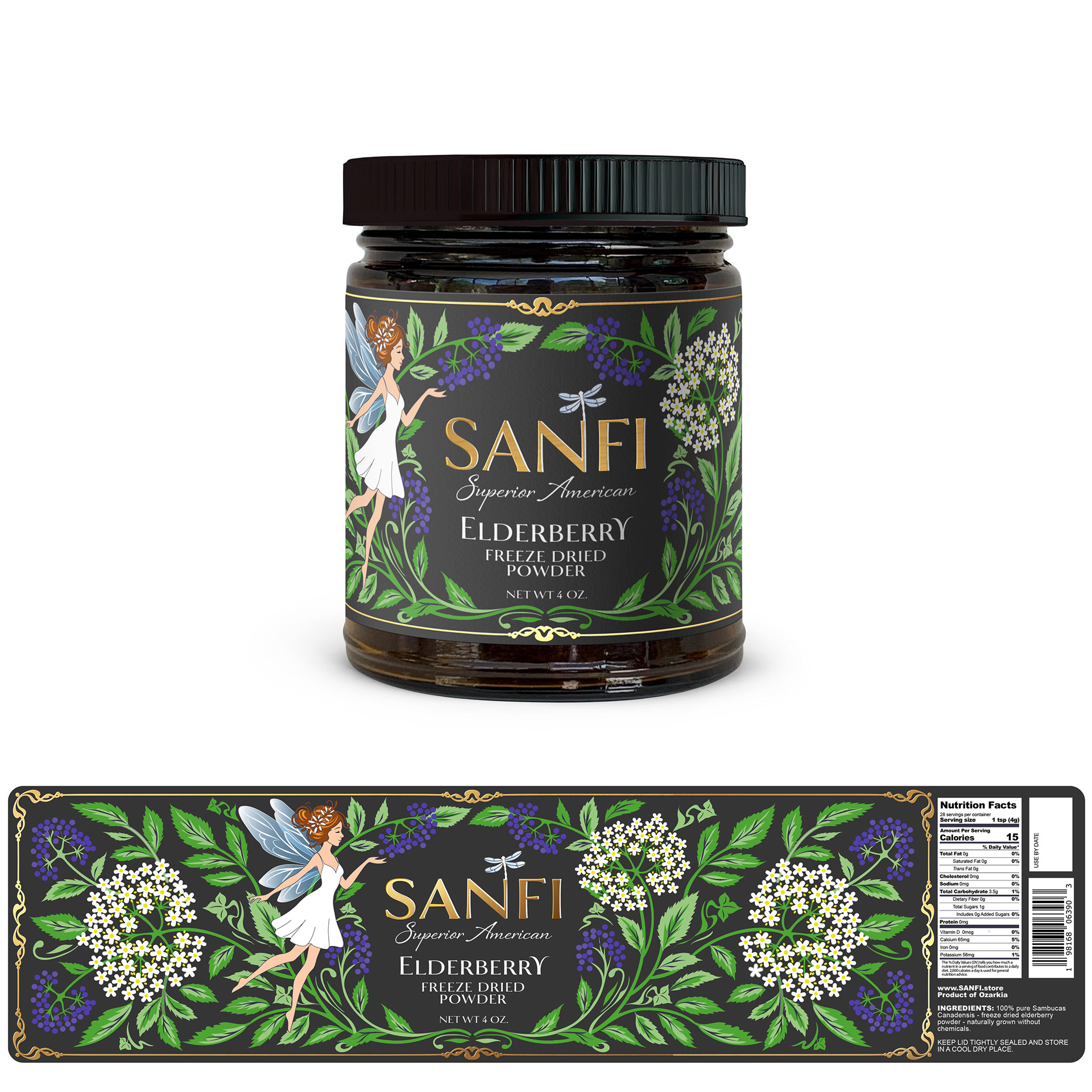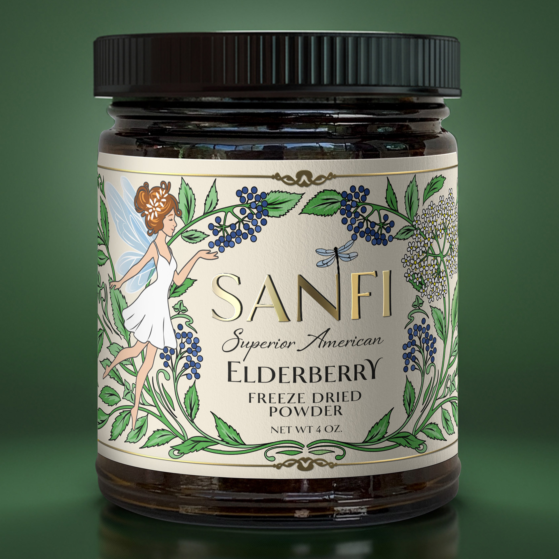 Elegant and whimsical label design for SANFI Elderberry Freeze-Dried Powder.
