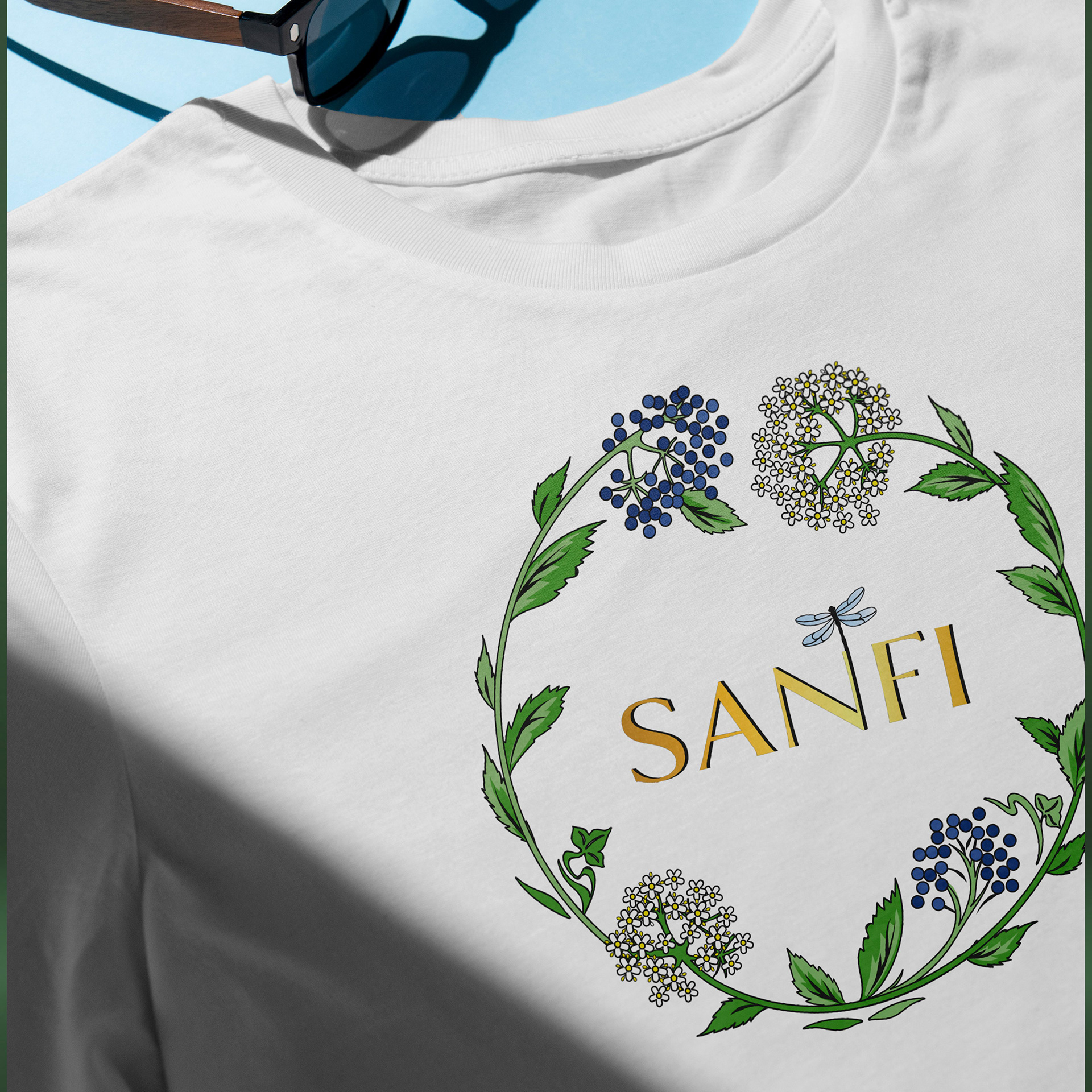 Blending botanical illustration with gold accents, the design evokes nature, purity, and a touch of magic — capturing the brand’s artisanal and premium essence. See also SANFI logo project.