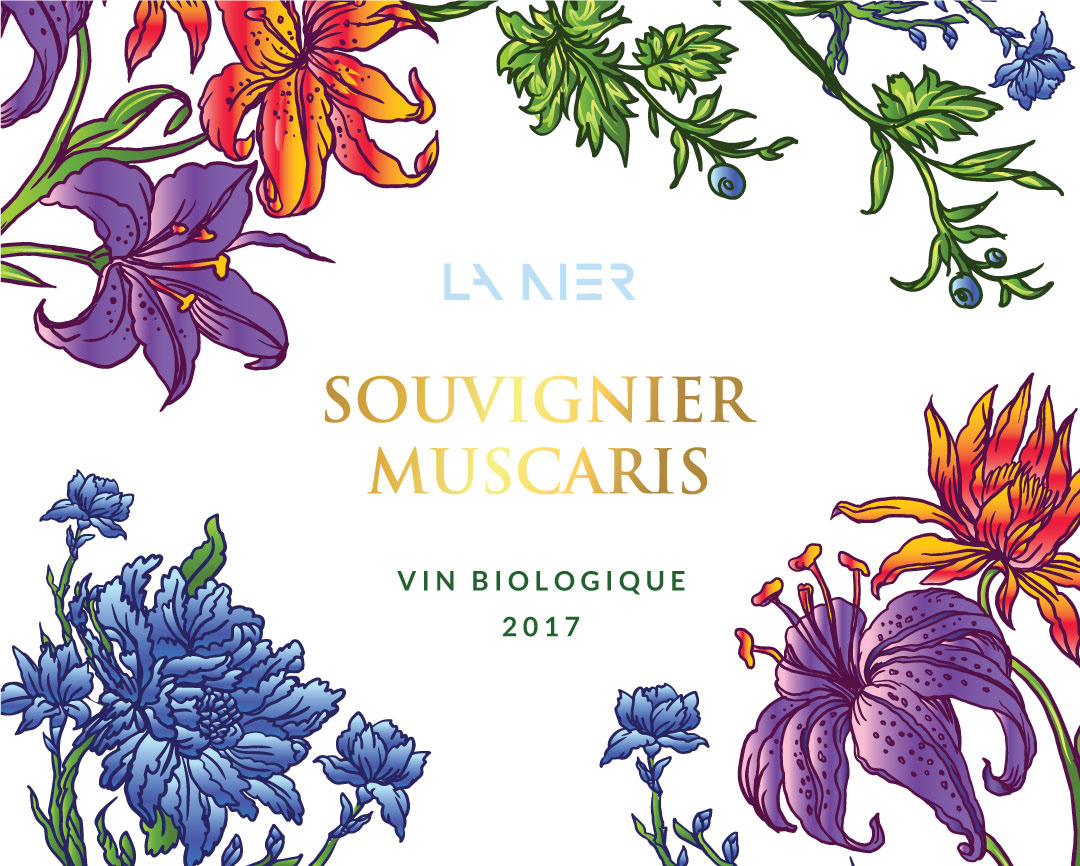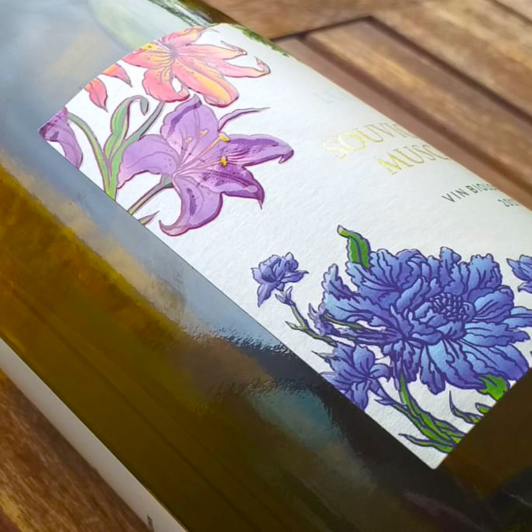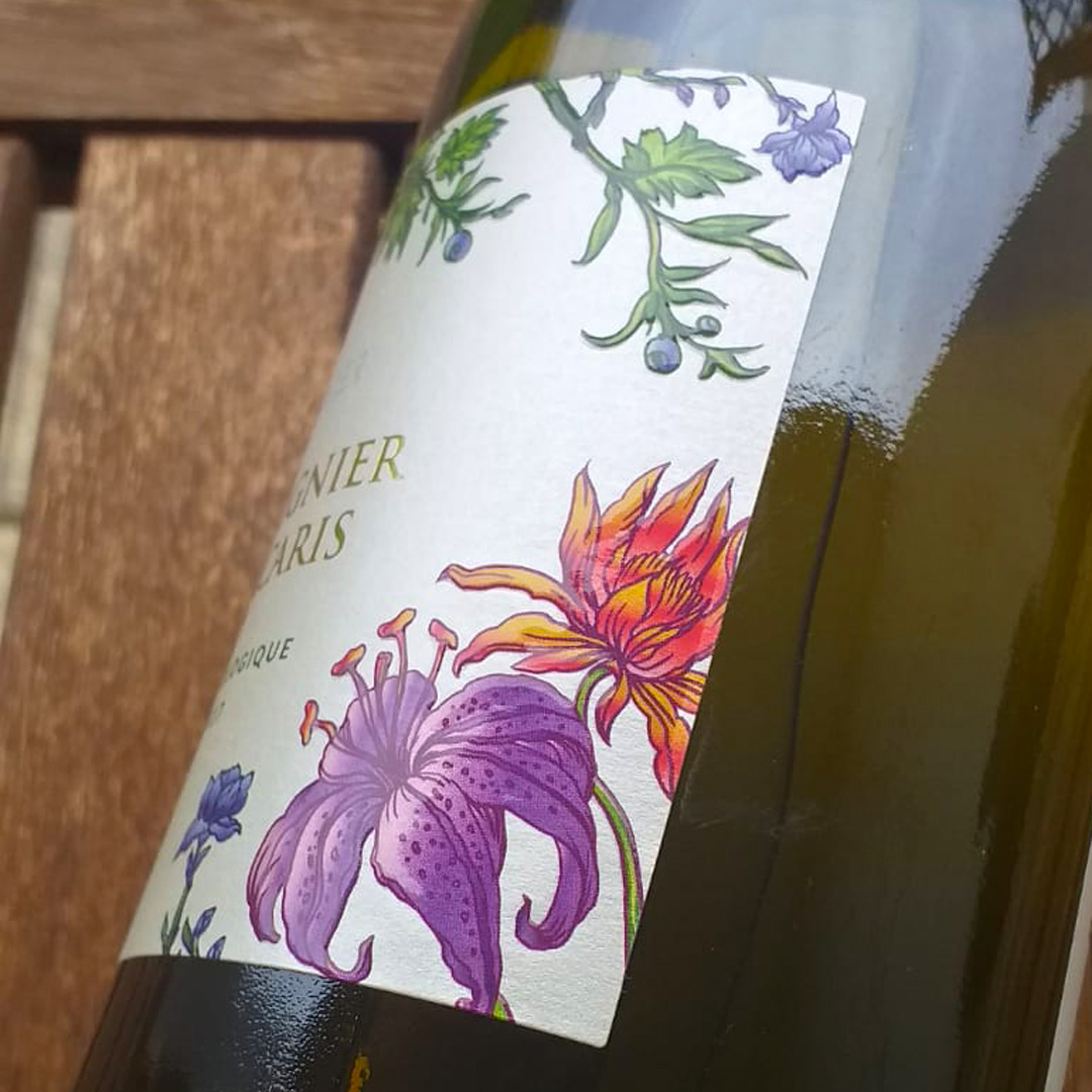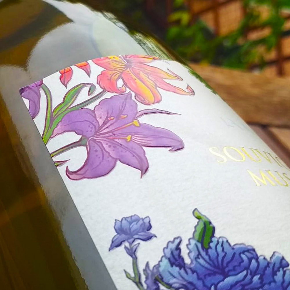 The design celebrates the organic origins of the wine with a rich botanical illustration framing the label. Hand-drawn flowers in vivid hues of orange, purple, blue, and green create a dynamic contrast against the white background, symbolizing vitality and freshness. The artwork was beautifully printed using a lacquer technique, which adds subtle dimension to the flowers and gives them an elegant shine.