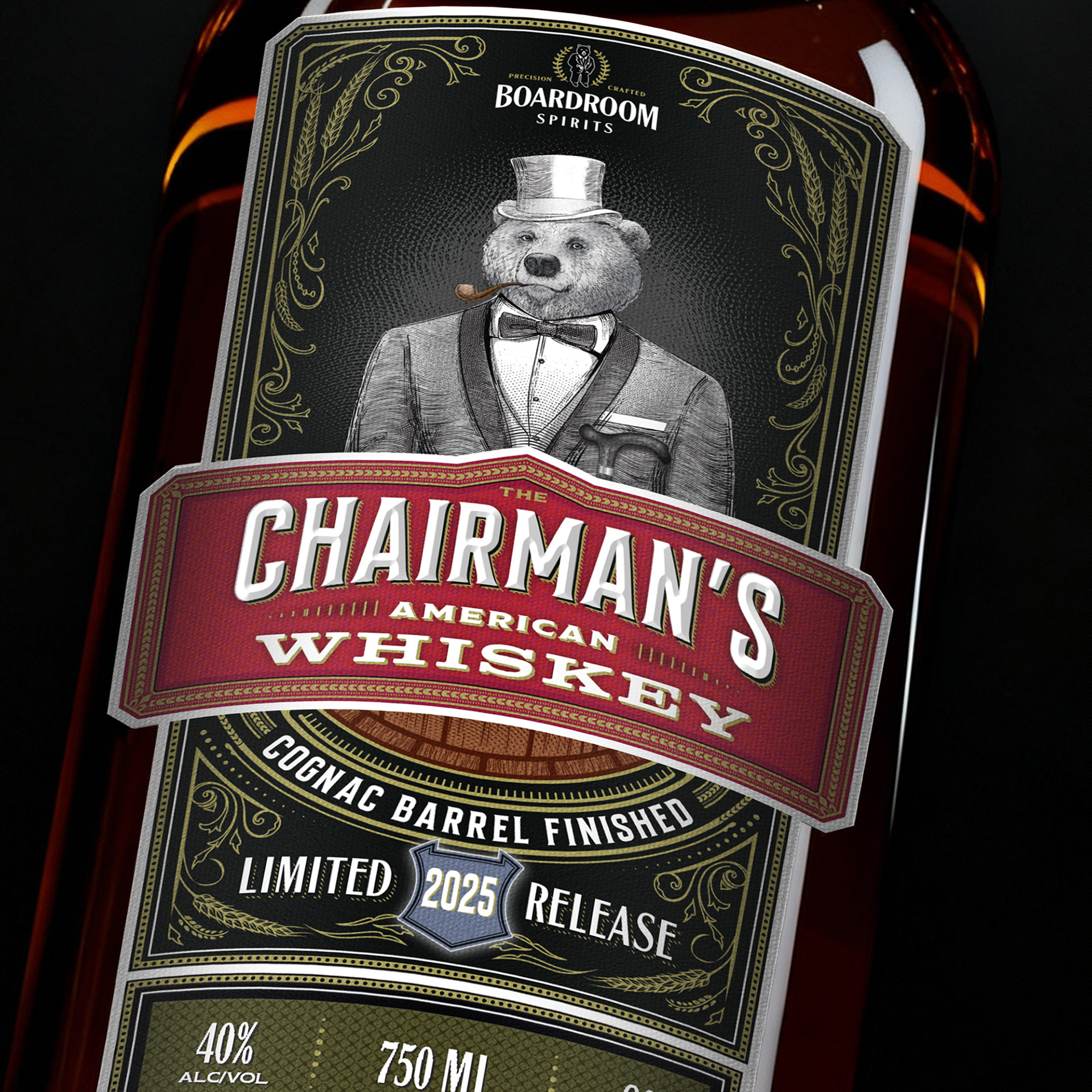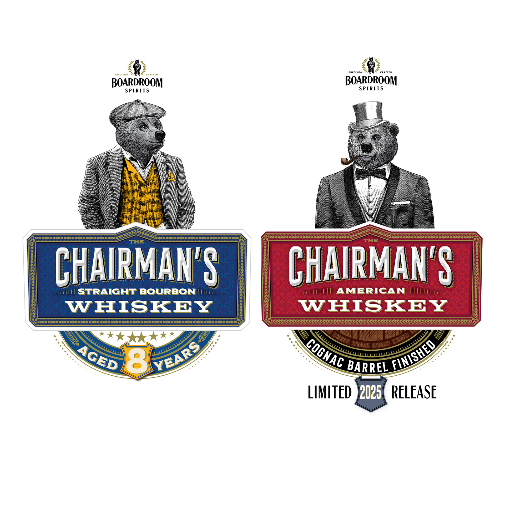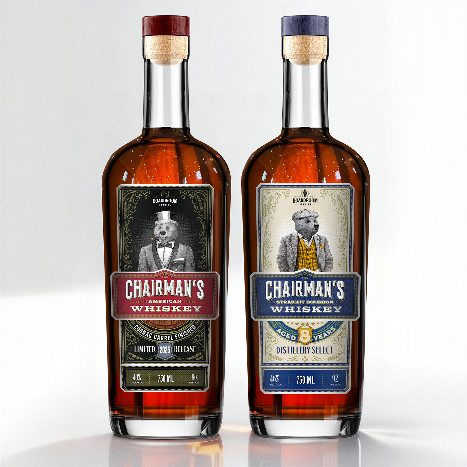This duo of labels showcases a sophisticated, character-driven visual identity for Chairman’s Whiskey and Chairman's Bourbon, each styled to reflect the personality of the spirit. For the Straight Bourbon, a sociable and approachable drink, the Chairman appears in stylish yet casual attire, setting a warm and friendly tone. For the American Whiskey Limited Edition, the same character is elevated with a tuxedo and top hat, signaling a more prestigious, refined release.