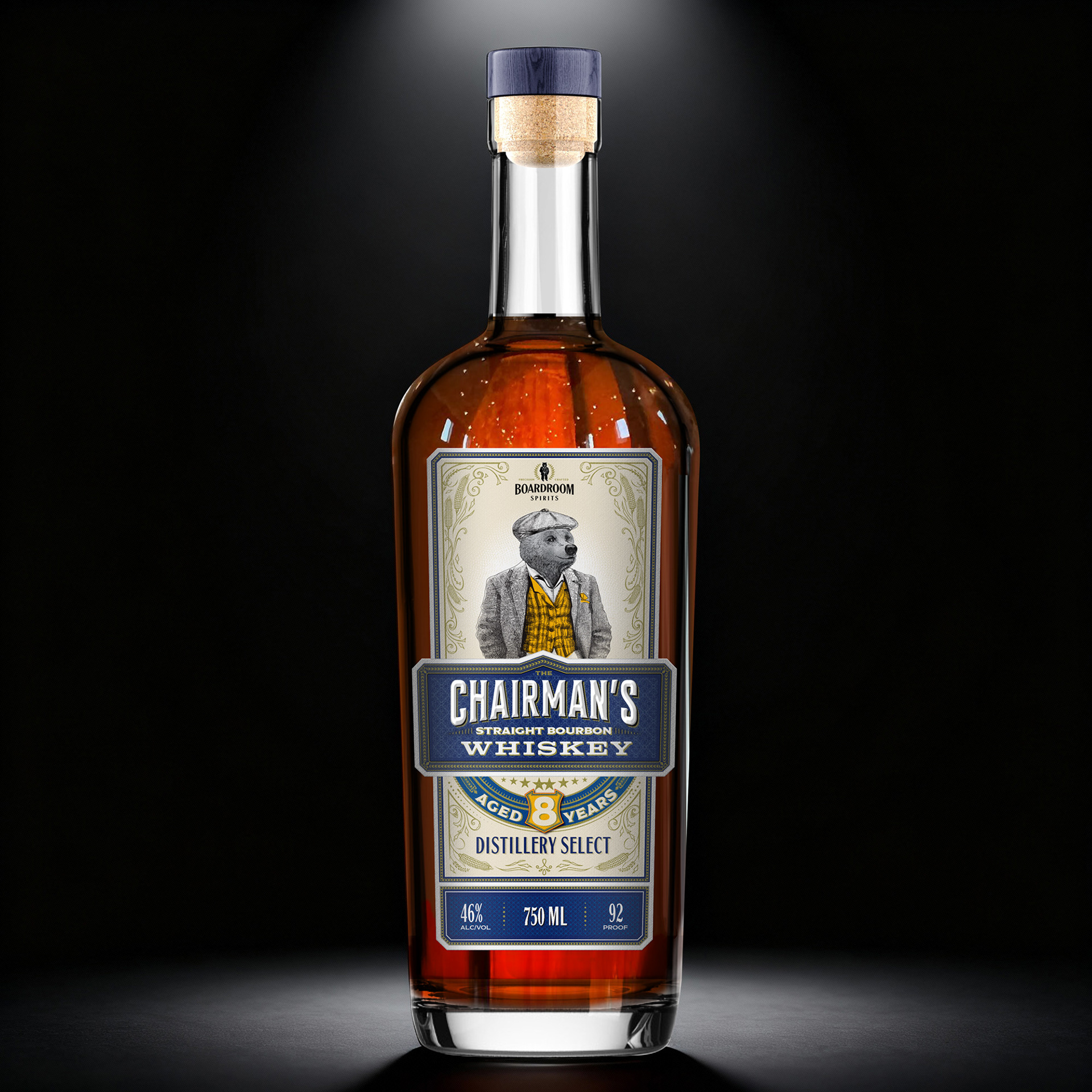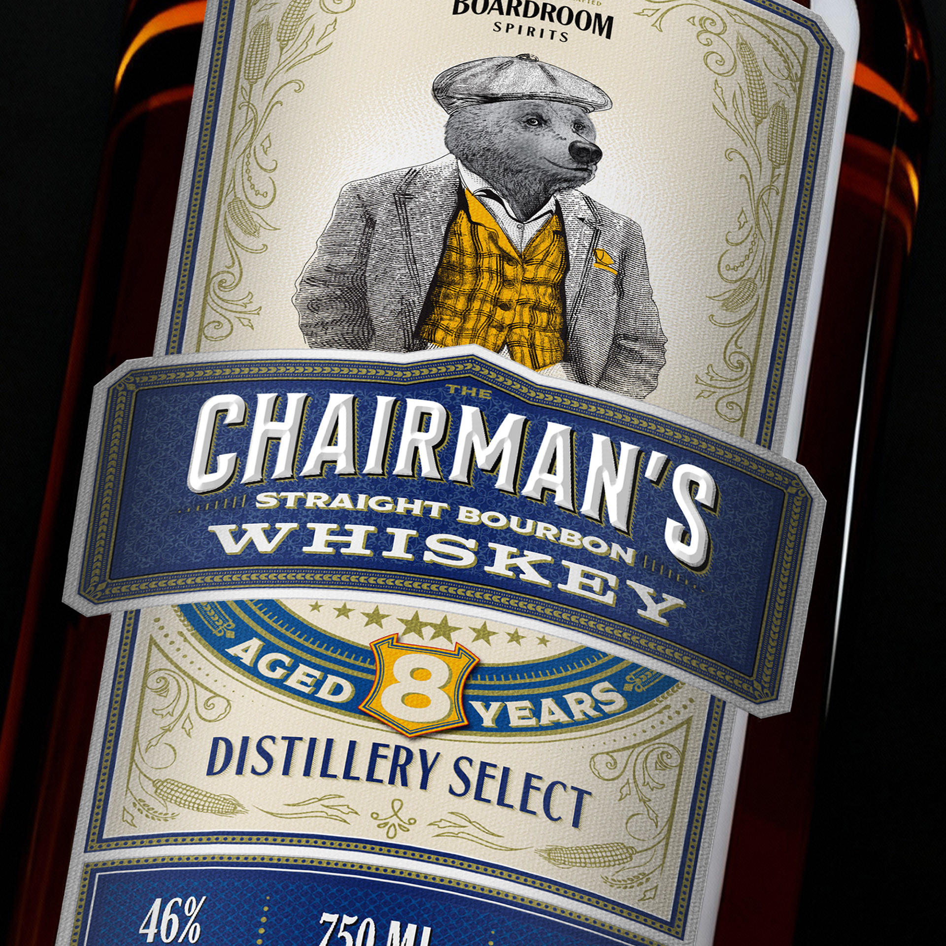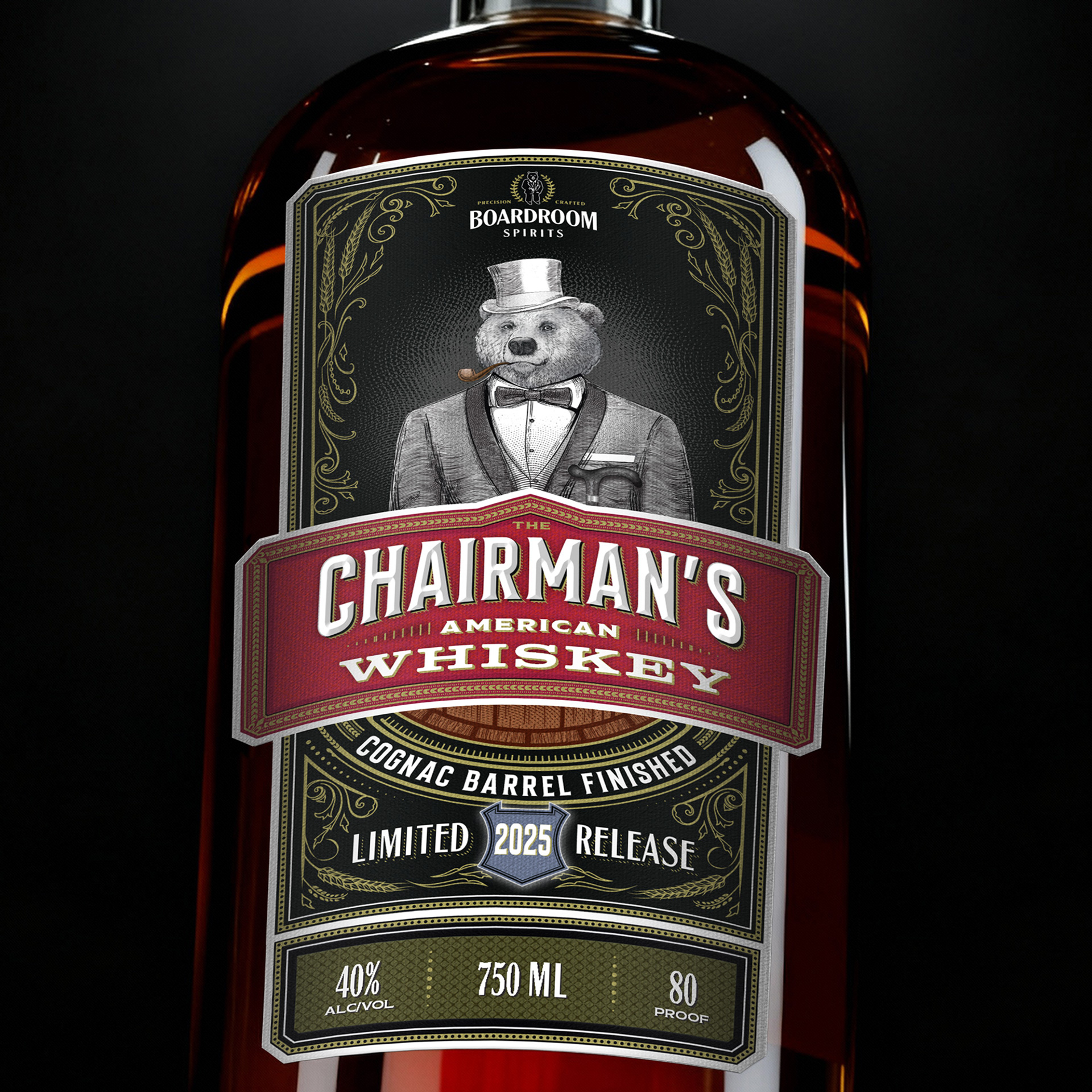 This duo of labels showcases a sophisticated, character-driven visual identity for Chairman’s Whiskey and Chairman's Bourbon, each styled to reflect the personality of the spirit. For the Straight Bourbon, a sociable and approachable drink, the Chairman appears in stylish yet casual attire, setting a warm and friendly tone. For the American Whiskey Limited Edition, the same character is elevated with a tuxedo and top hat, signaling a more prestigious, refined release.