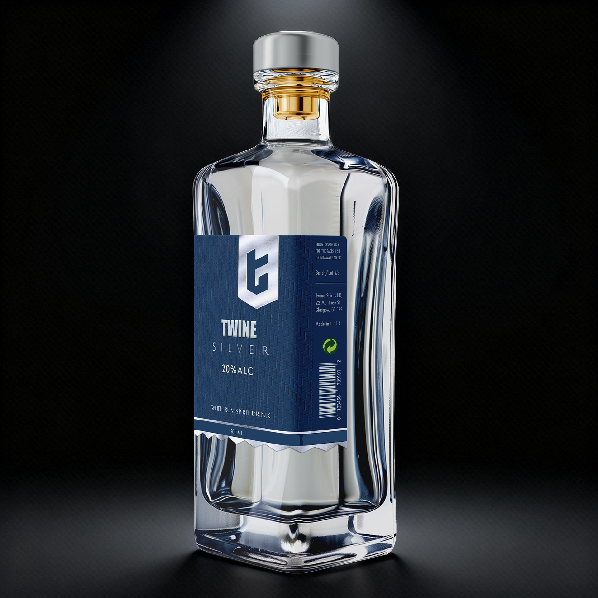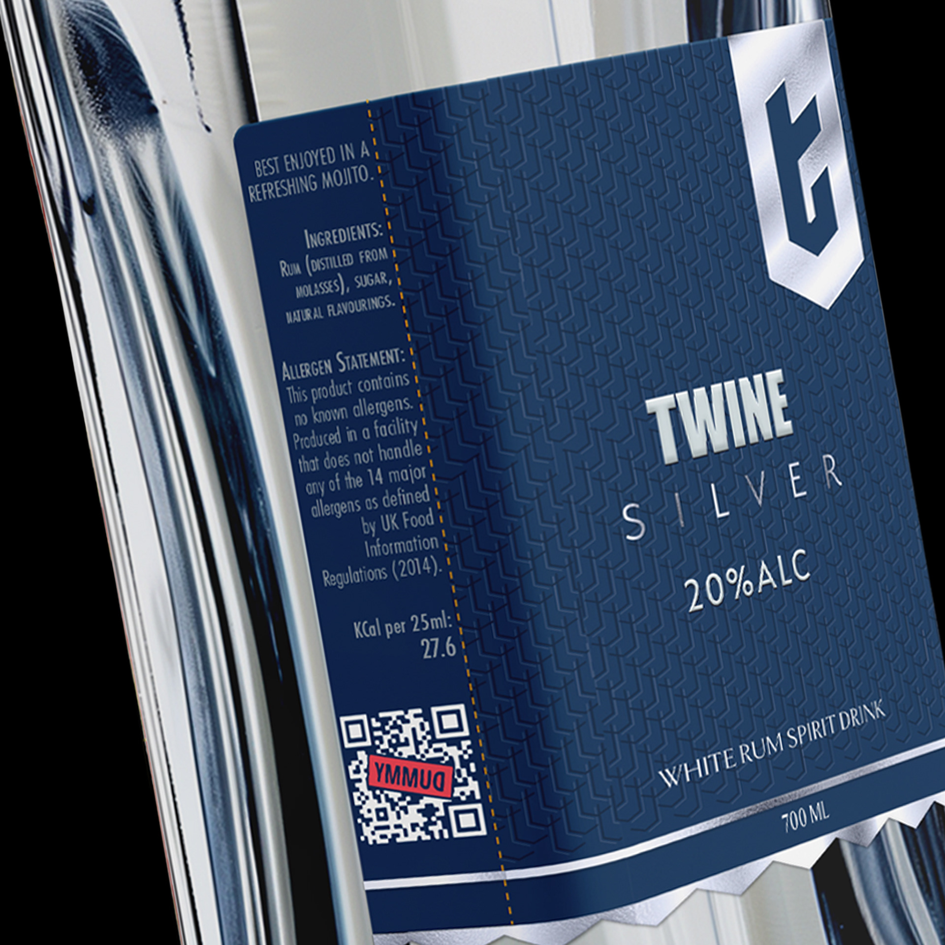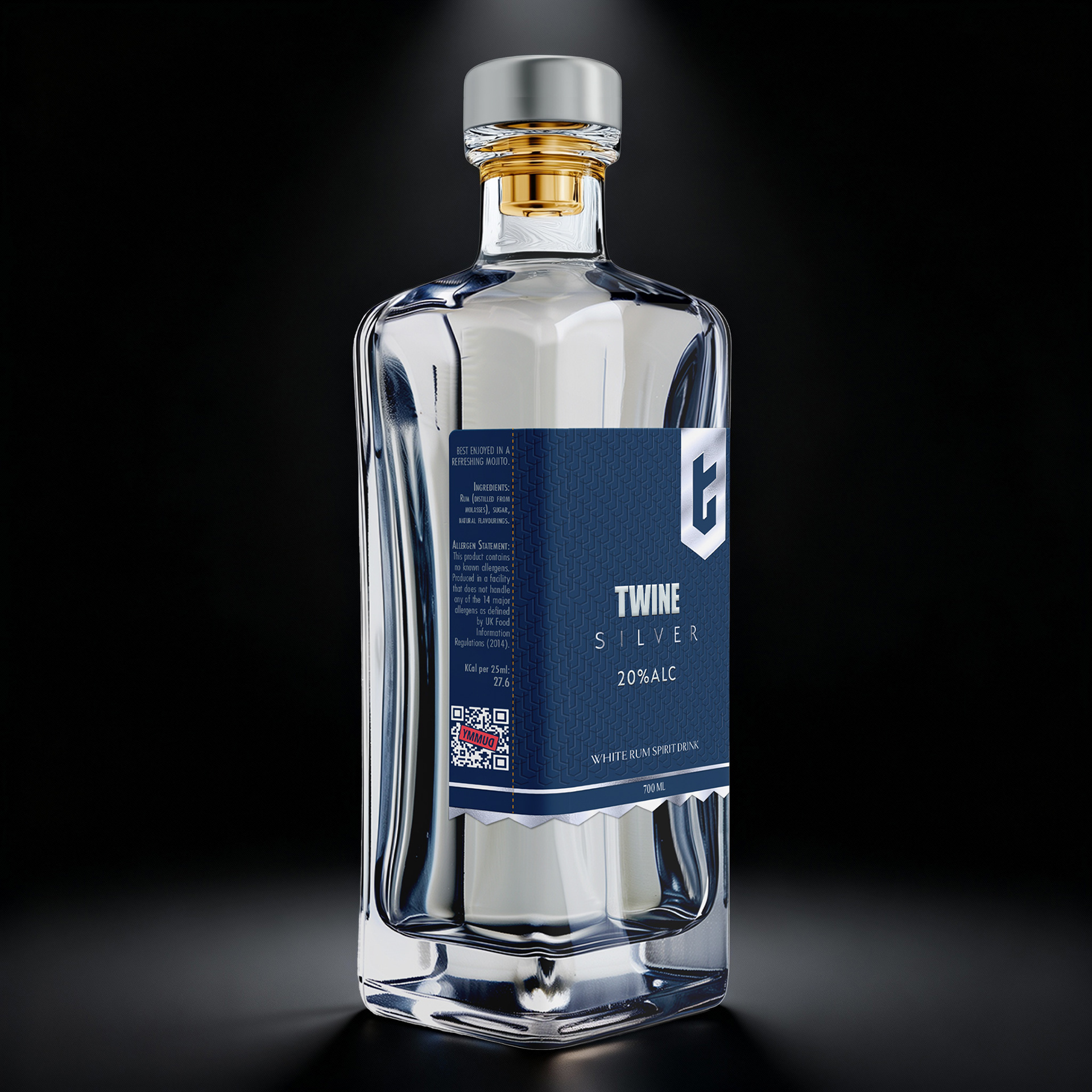 - silver label contrasts with cool silver and deep navy hues, symbolizing clarity, purity, and the smooth finish of white rum.